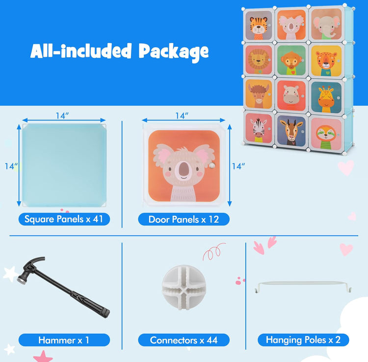 12-Cube Closet Shelves, DIY Plastic Wardrobe, Modular Bookcase with Doors for Bedroom, Living Room, Office, Black. GREAT FOR STORAGE: Organize your folded clothes? Store your bags? Store your books or magazines? This plastic organizer can do all these tasks. More stable than ever, connected by durable ABS plastic parts and equipped with an anti-tip kit, the sturdy metal frame panels provide great stability; Each cube measures 11.8"L x 11.8"W x 11.8"H, making it much more stable than before.