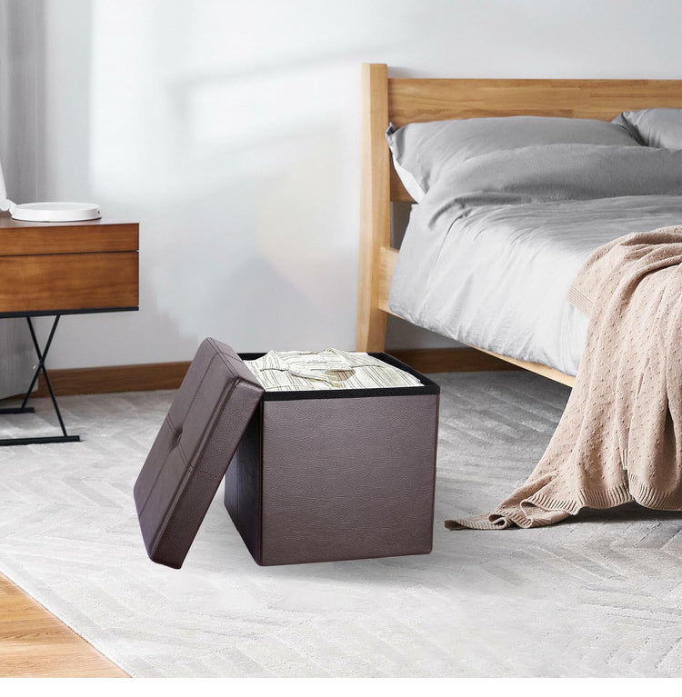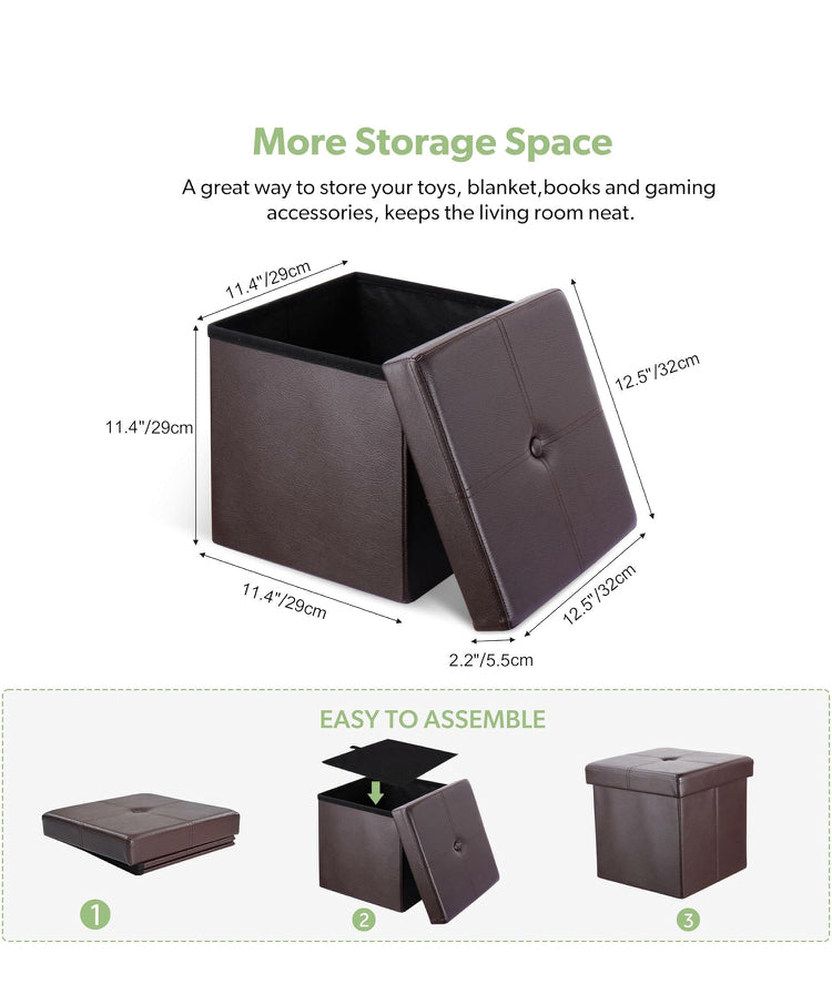Foldable Storage Ottoman Foot Rest Stool- Faux Leather Footrest with Padded Seat for Living Room Bedroom (12.5-inch, Brown)