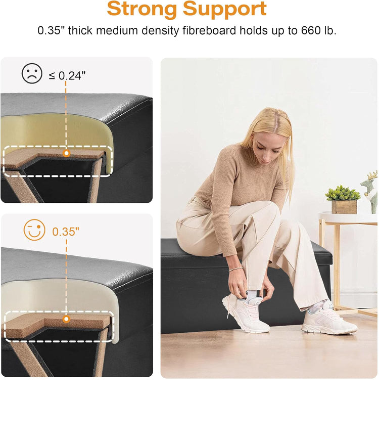 - 【FOLDABLE & EASY TO ASSEMBLE】Transportable and lightweight storage bench that can be easily relocated to different spaces. Quickly folds away when not in use, no tools required. Measure 45" x 15" x 15" (114 x 38 x 38 cm). Comfortable height for sitting & resting your feet or legs.